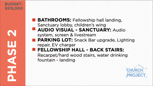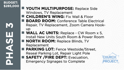 The total estimated cost of the CIP is $1.5 million, divided into three manageable phases. By organizing it this way, we can work toward our goals step-by-step, making steady progress with the support of our dedicated church family.